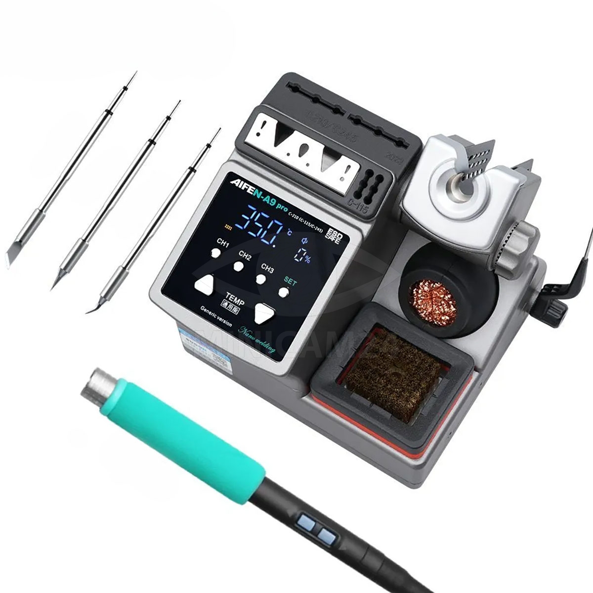 Паяльная станция AIFEN A9 Pro оснащена защитой от короткого замыкания и возможностью включения/выключения звукового сигнала. Станция совместима с жалами типа С210. В комплект поставки входят паяльная станция, паяльник, наконечник T245, металлическая чистящая щетка, инструкция по эксплуатации и три паяльных жала (245K, 245I, 245IS).