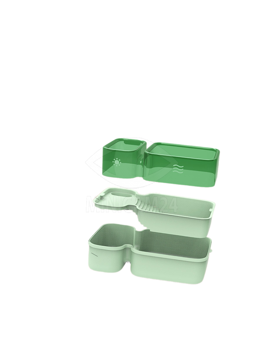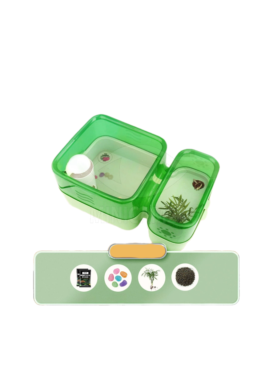 Конструкция террариума включает функциональную перегородку, которая помогает разделить пространство и улучшить фильтрацию воды. Многослойная система разделения гарантирует, что отходы, включая испражнения черепах, аккуратно стекают на дно с потоком воды, обеспечивая чистоту в резервуаре. После использования достаточно поднять верхний слой и открыть слив, что позволяет быстро и удобно промыть аквариум.