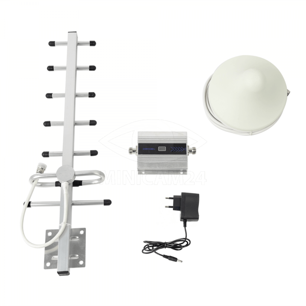Комплект состоит из внешней директорной антенны, блока усиления, внутренней антенны круговой направленности и адаптера питания от сети 220 В. Блок усиления выполнен в металлическом корпусе и предназначен для установки внутри помещения. Комплект усиливает сигнал сотовой связи стандарта 900 МГц / 2G GSM. Площадь покрытия до 60-80 м. кв.